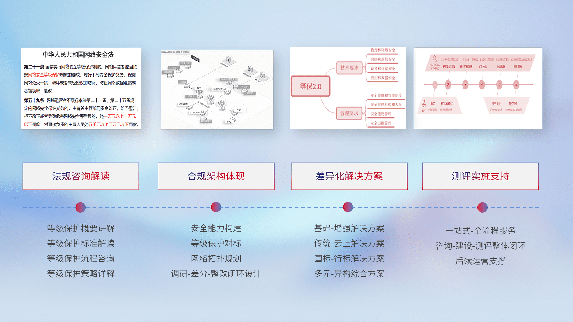 通过专业的法律咨询解读、、合规架构体现、、、、差异化解决方案、、测试实施支持等服务,,为客户量身打造等保合规体系。。。